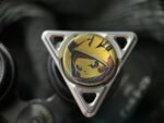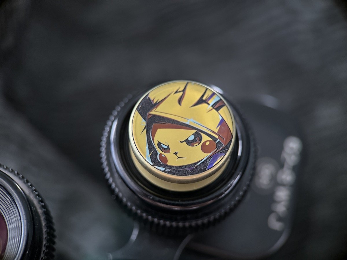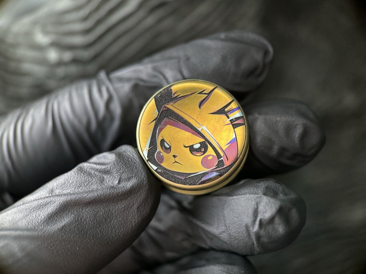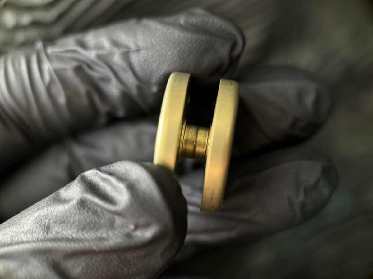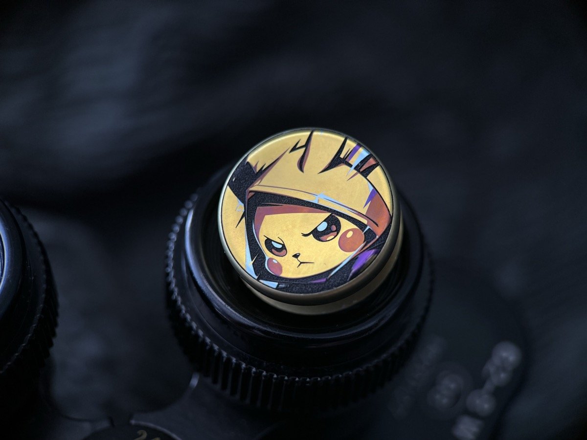 Made of titanium alloy, the gold coloured surface is titanium anodised and has engraved depressions for the black areas to maintain a certain tactile feel.